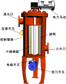 采用機(jī)電一體化設(shè)計(jì)。全自動(dòng)自清洗過(guò)濾器由驅(qū)動(dòng)機(jī)構(gòu)、控制管路(包括壓差開關(guān))、主管組件、濾芯組件、清洗機(jī)構(gòu)、連接法蘭等主要零部件組成。 電控器、控制管路和排污閥構(gòu)成過(guò)濾器的控制部分,用于實(shí)現(xiàn)自動(dòng)清洗排污過(guò)程。 控制管路由壓差開關(guān)、管接頭、黃銅管等附件組成。過(guò)濾器常規(guī)產(chǎn)品使用不銹鋼轉(zhuǎn)刷,也可根據(jù)不同的使用條件(水溫、水質(zhì)),選用其它材質(zhì)的轉(zhuǎn)刷。